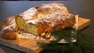 Bei 170 Grad ca. 60 Minuten backen. Fertigen Stollen herausnehmen, überkühlen lassen, mit Marzipan umhüllen und mit Pistazien garnieren.