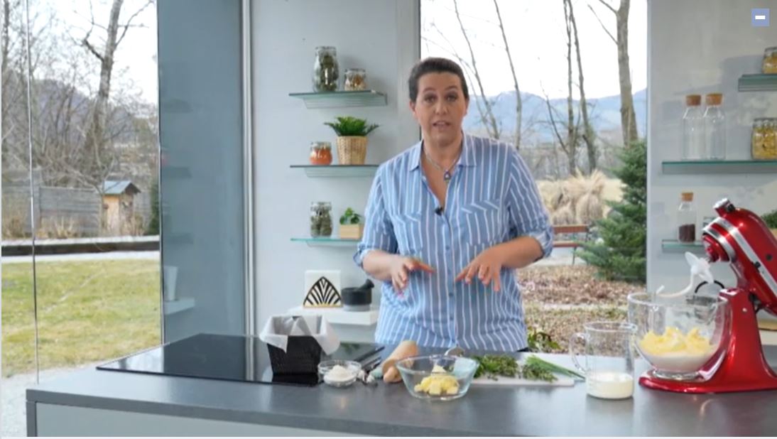 In der Zwischenzeit die Kräuter und den Meerrettich zerkleinern und mit Butter abrühren.