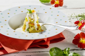 Die Nudeln in der Sauce schwenken, anrichten und mit dem Kaviar verfeinern.