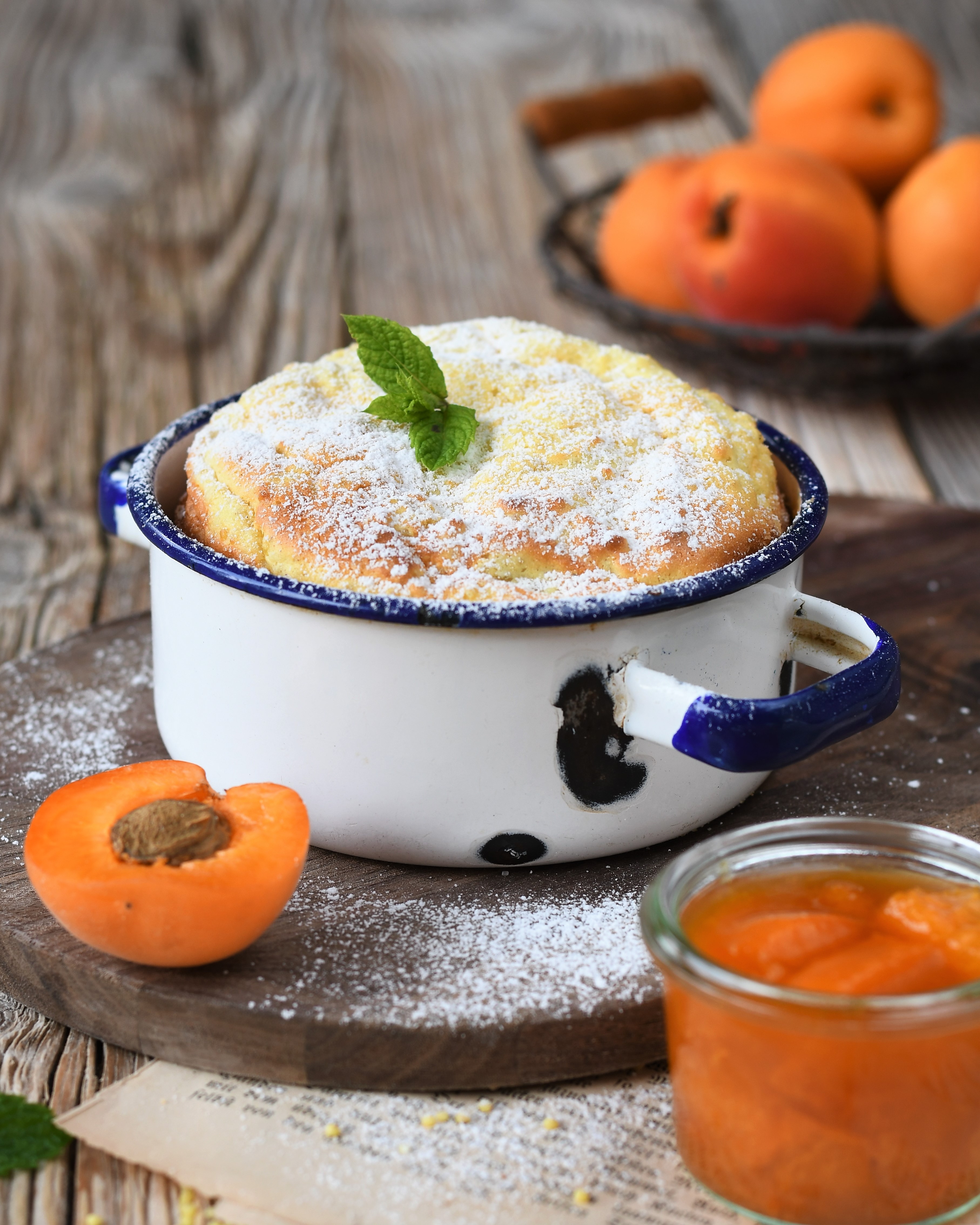 Das Soufflé lauwarm mit Marillenröster servieren.