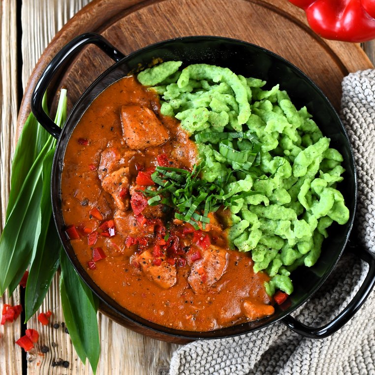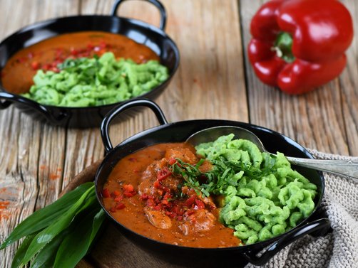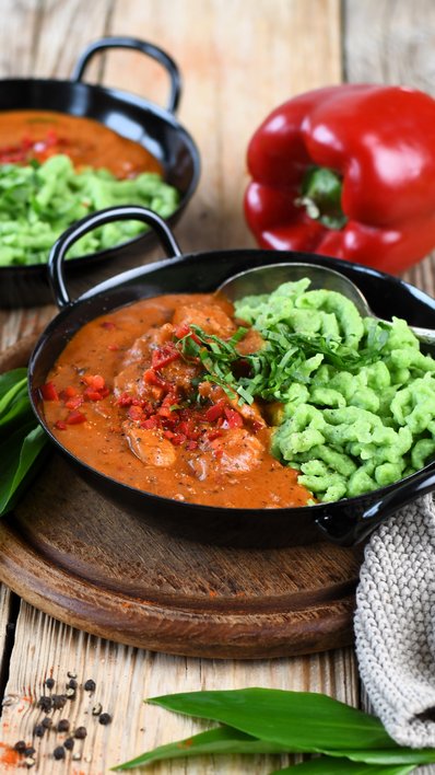 Spätzle absieben und mit kaltem Wasser abschrecken. Gulasch mit Spätzle anrichten.