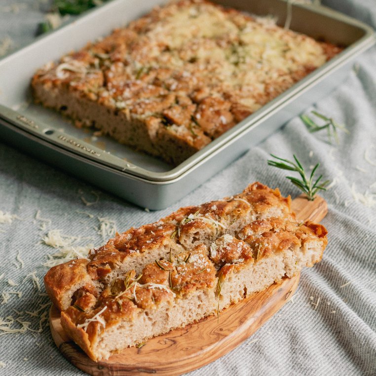Mit den Fingern Vertiefungen in den Teig drücken und zum Schluss mit dem restlichen Almkönig bestreuen. Die Focaccia 25-30 Minuten goldbraun backen.