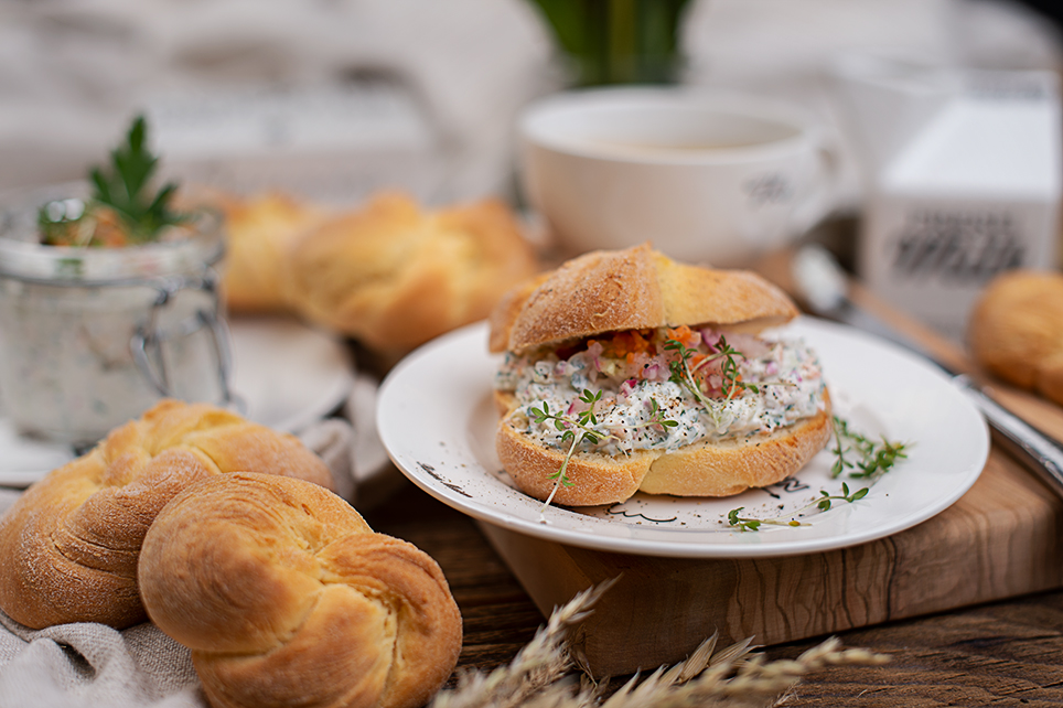 Die Joghurt-Weckerl gemeinsam mit dem Topfen-Gemüseaufstrich servieren.