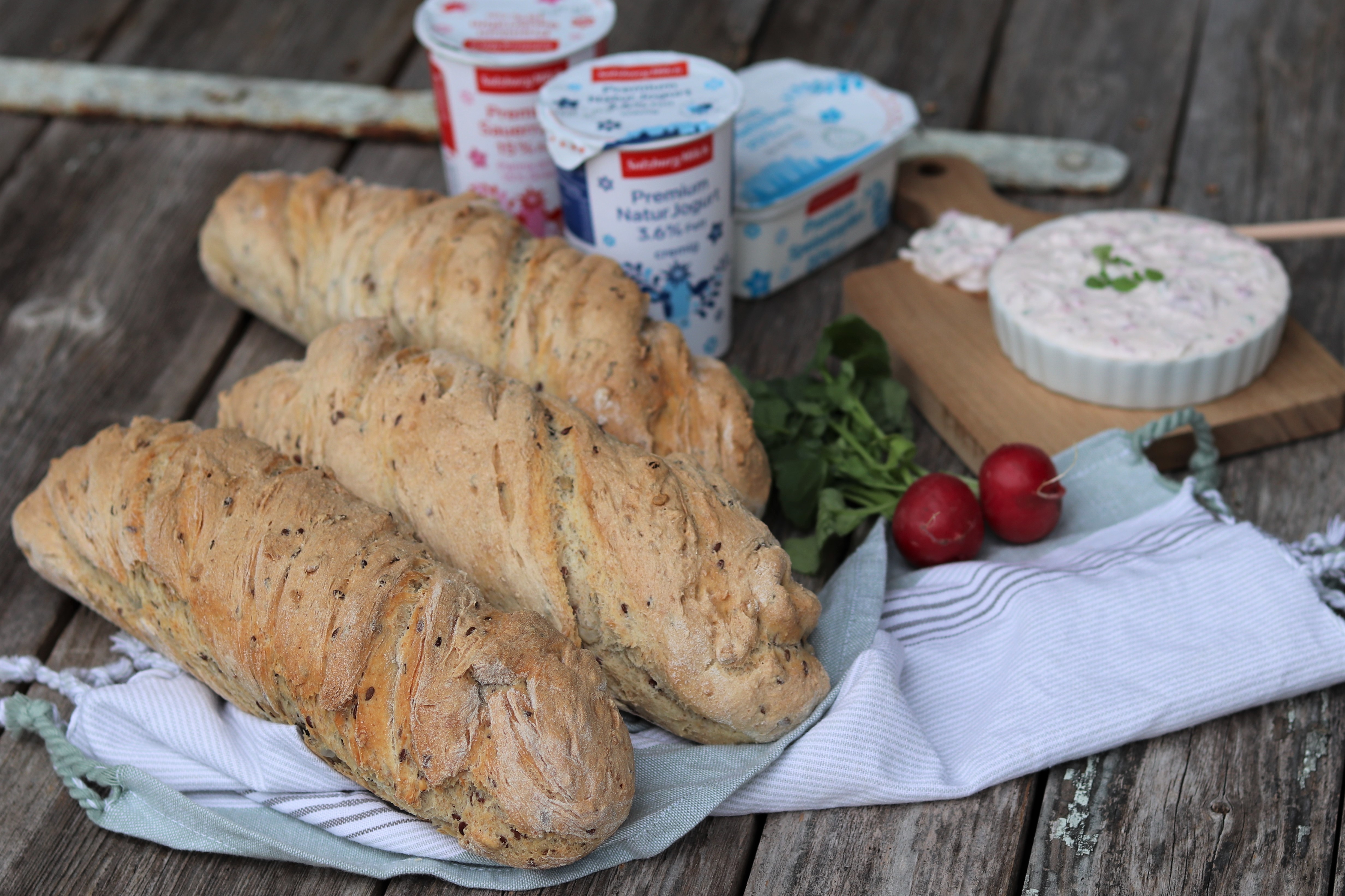 Die Brotstangen auf ein Backblech geben und bei 200°C etwa 30 Minuten goldbraun backen.