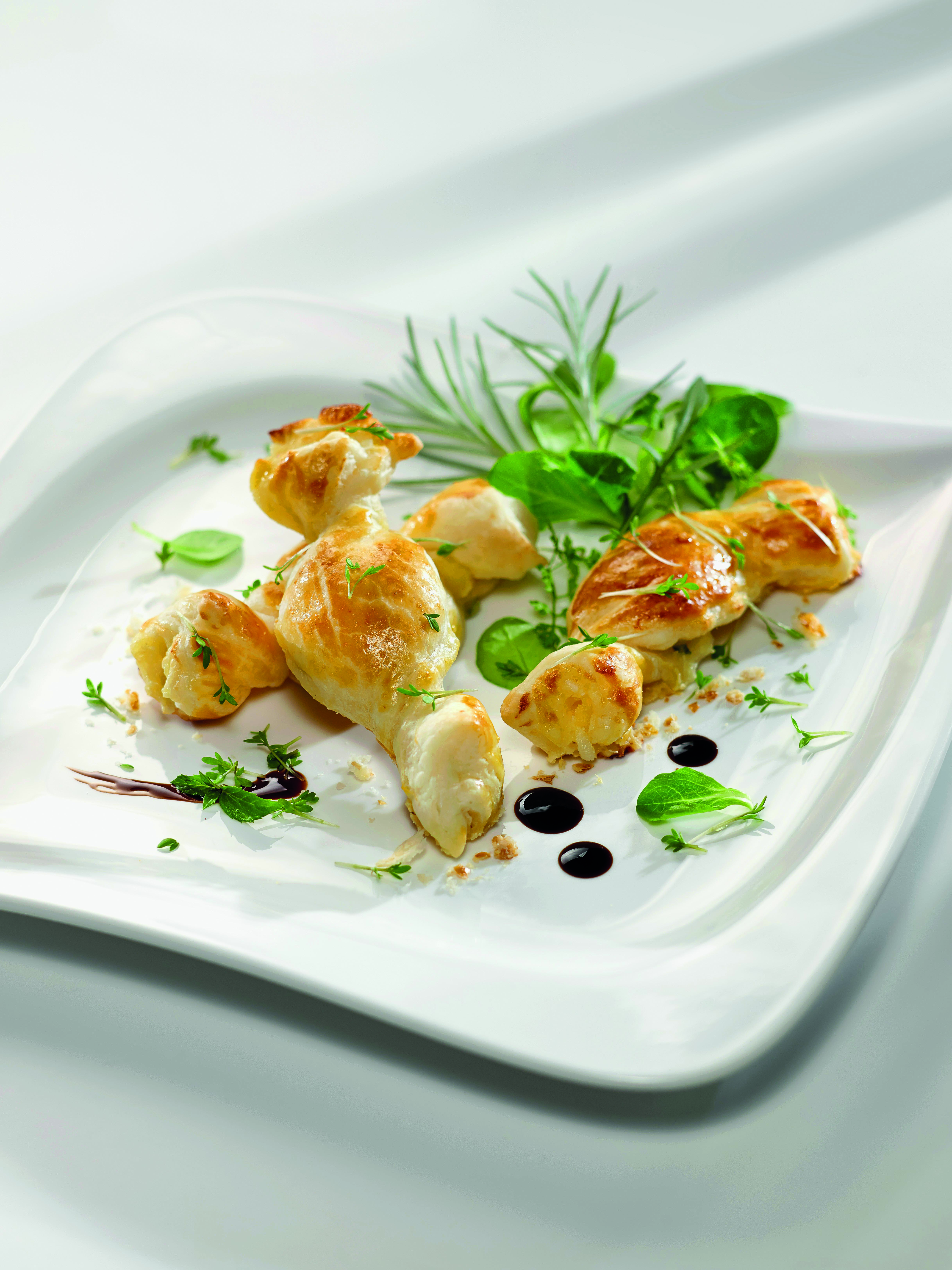 Danach je ein bis zwei Teelöffel Käsemasse in die Mitte der Rechtecke geben, Teigränder gut mit Eiweiß bestreichen und an der Längsseite aufrollen.