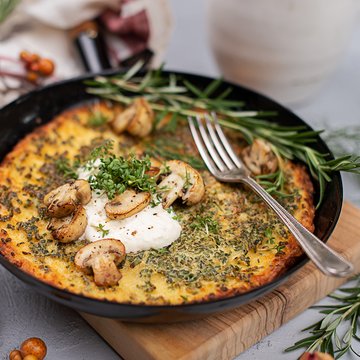 Den Pfannenkuchen mit gebratenen Champignons sowie einem Klecks Sauerrahm und frischer Kresse garniert, servieren.