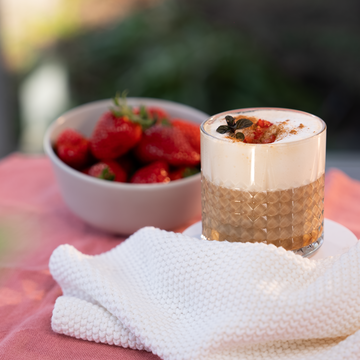 Einen frisch gebrühten Espresso dazugeben und mit aufgeschäumter Milch aufgießen. Den Milchschaum mit frischen Erdbeeren und etwas Zimt dekorieren.
