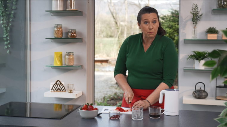 Falls Sie den Erdbeer-Latte als Kaltgetränk konsumieren wollen, einfach den Espresso abkühlen lassen und statt der Erdbeermarmelade etwas Erdbeereis verwenden.