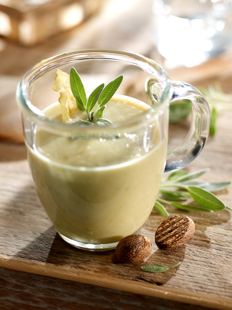 Anschließend Suppe im Kühlschrank kalt stellen und danach mit Salbei garniert servieren.