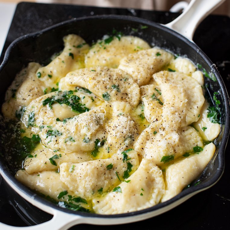 Butter in einer Pfanne schmelzen, die gehackte Petersilie darin kurz mitbraten und die Kartoffeltaschen darin schwenken.