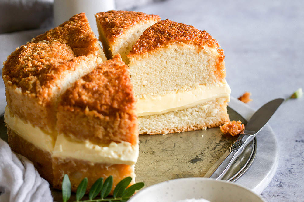 In der Mitte auseinanderschneiden. Den Deckel gleich in die gewünschte Anzahl an Stücken portionieren. Die Creme auf den Boden geben, die Deckeltortenstücke darauflegen und mindestens eine Stunde im Kühlschrank kaltstellen, bevor der Bienenstich serviert wird.