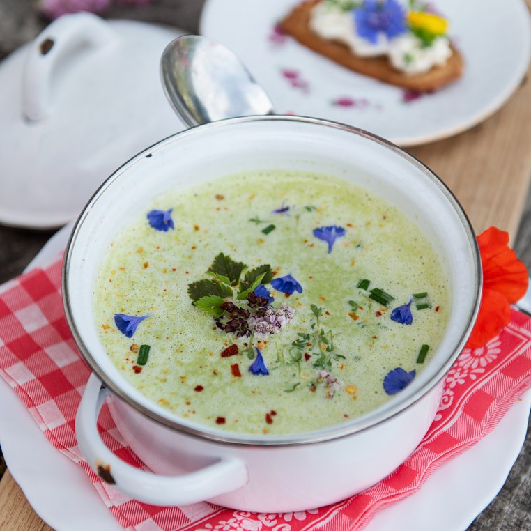 Die Suppe mit frischen Kräutern und essbaren Blüten garniert servieren.