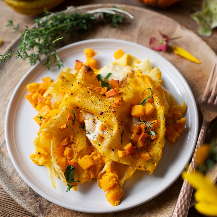 Mit den kleinen Kürbiswürfeln, geriebenem Käse und gehackten Kräutern toppen und im vorgeheizten Backofen bei 180°C Heißluft für rund 30 Minuten überbacken.