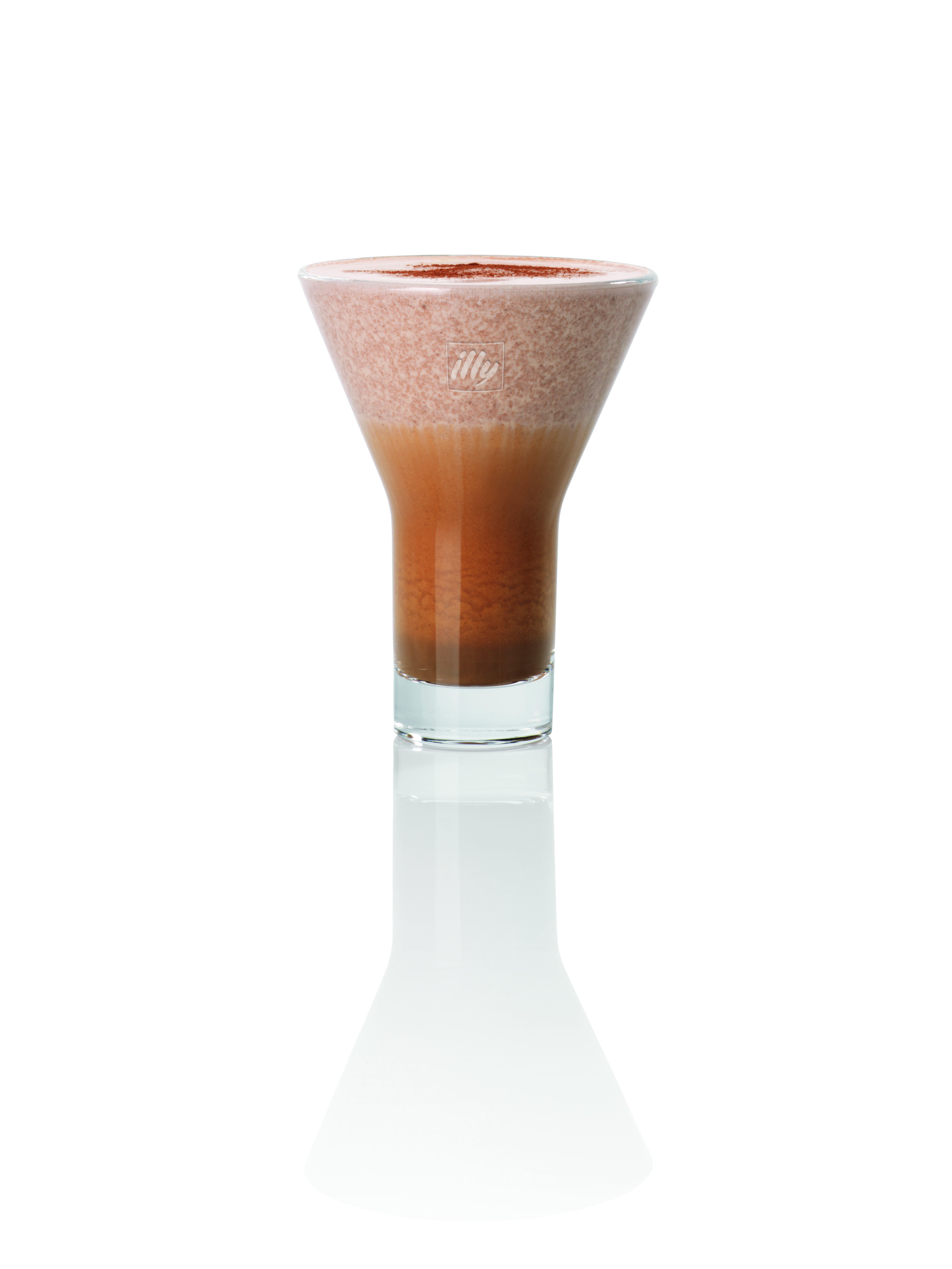 Das Frappé aus Milch und Kakaopulver in ein Glas von 150 ml Fassungsvermögen geben und den heißen Espresso in die Mitte des Getränks gießen.