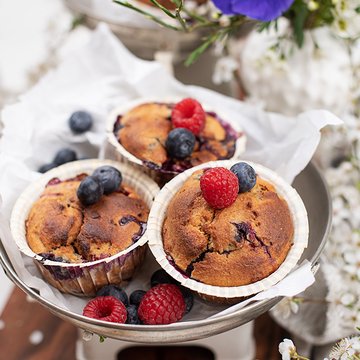 Das Mehl mit dem Backpulver verrühren und mit der geschmolzenen Butter, dem Ei, dem Honig, dem Naturjoghurt sowie dem Topfen zu einem glatten Teig verrühren. Zum Schluss die Beeren unter den Teig heben.