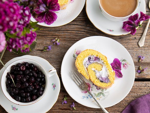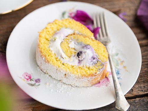 Die Roulade ausrollen, mit der Füllung bestreichen, die Heidelbeeren darauf verteilen und wieder einrollen.