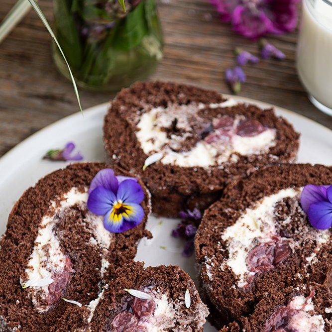 Die Roulade ausrollen, die Sauerkirschen darauf verteilen, mit der Creme bedecken und wieder einrollen.