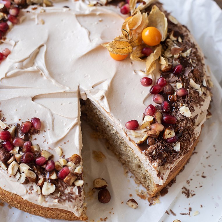 Mehl, Backpulver und geriebene Nüsse unterheben und den Teig in eine Kuchenform mit 24 Zentimetern Durchmesser füllen.
