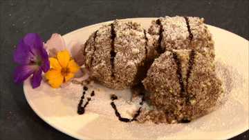 Mit Brösel, Maronipürree und Schokosauce anrichten.