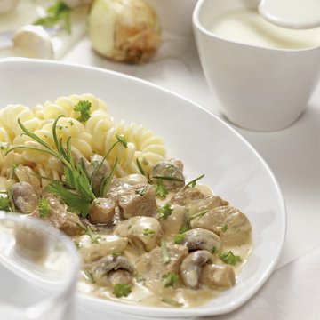 Anschließend den Topf öffnen und bei starker Hitzezufuhr unter ständigem Rühren so lange einkochen lassen, bis eine sämige Sauce entstanden ist (Crème fraîche einrühren). Mit Salz und Pfeffer abschmecken und mit frisch gehackter Petersilie bestreut servieren.