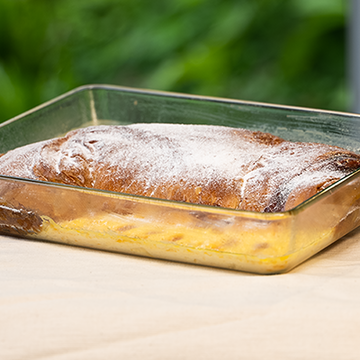 Ungefähr ein Viertel der Guss-Menge (Milch, Eier, Staub- und Vanillezucker gut miteinander verrühren) über den Strudel gießen und diesen ca. 45 Minuten goldbraun backen.