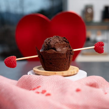 Die Spitze einer Erdbeere oder Himbeere abschneiden und auf einer Seite des Holzspießes aufstecken. Die andere Hälfte der Erdbeere (oder Himbeere) auf der anderen Seite des Holzspießes aufstecken. Das Ganze sollte wie ein Pfeil aussehen, der durch den Muffin geht.