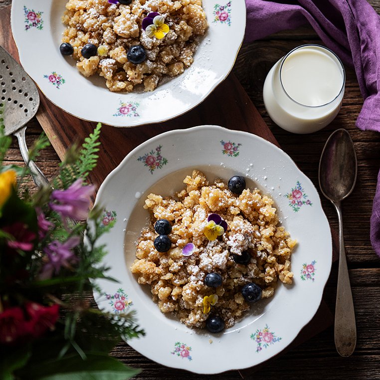 In einer Eisenpfanne Butter erhitzen und den Teig anbraten und in kleine Stücke reißen.
