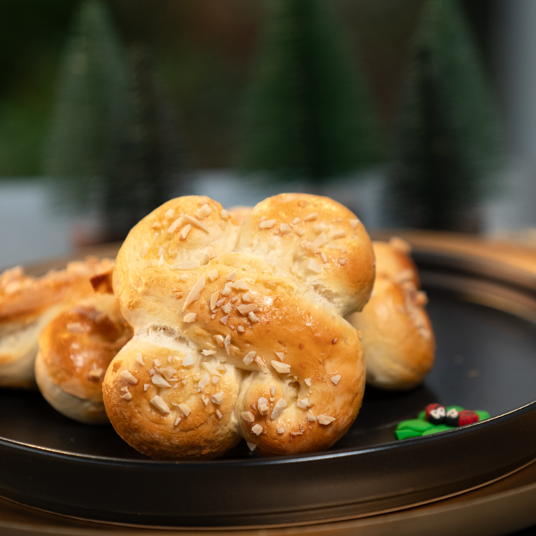 Vor dem Backen die Teiglinge noch mit einem Gemisch aus Eigelb und Milch bepinseln und mit gehackten Mandeln bestreuen. Gebacken wird bei 180 °C für ca. 20 Minuten.