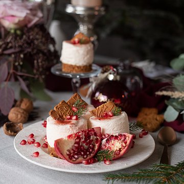 Danach aus den Förmchen lösen und mit essbarem Glitterspray und frischen Granatapfelkernen dekorieren.