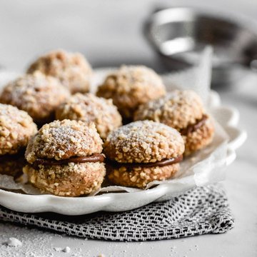 Aus dem Teig ca. 80 Kugeln formen und in den geriebenen Nüssen wälzen.