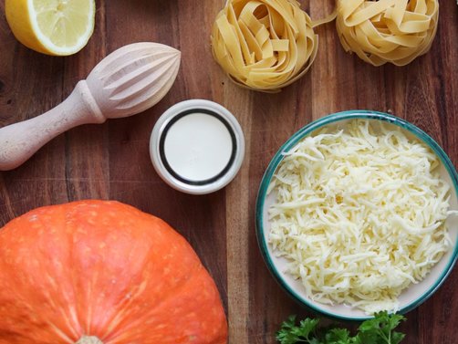 Den Hokkaido Kürbis waschen, entkernen und bei Bedarf schälen. In Würfel schneiden und gemeinsam mit den Zwiebelstücken mit der Butter in einer Schmorpfanne unter Rühren andünsten.