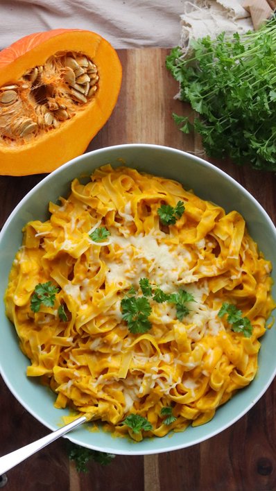 Die Nudeln in die Sauce hinzufügen und etwa 10 Minuten weich kochen. Zwischendurch umrühren. Falls die Nudeln eine längere Garzeit haben, einfach etwas Gemüsebrühe nachgießen