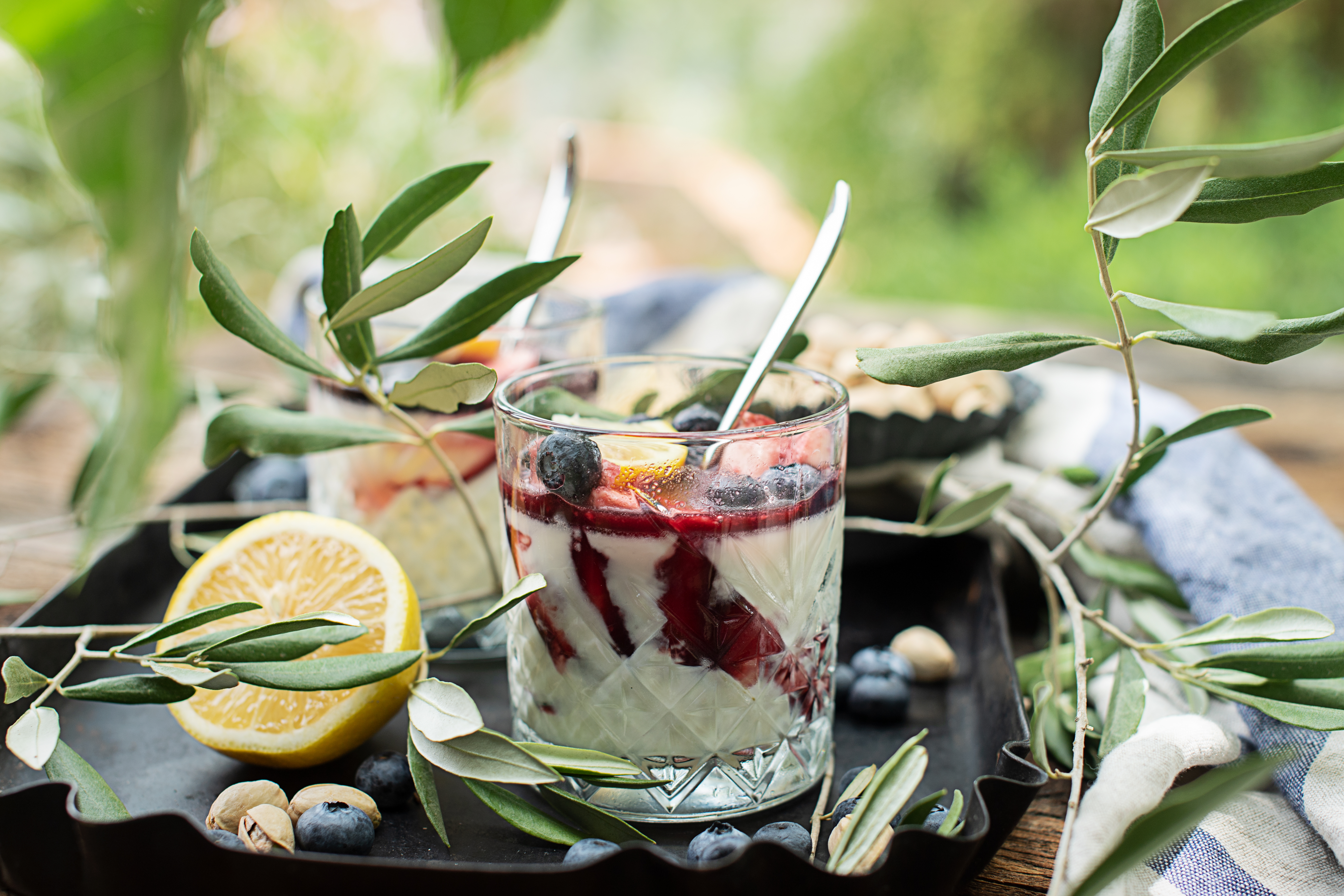 Die Panna Cotta in Gläser füllen und für mindestens vier Stunden oder über Nacht in den Kühlschrank geben. Vor dem Servieren mit Beerensirup toppen und mit frischen Beeren garnieren.