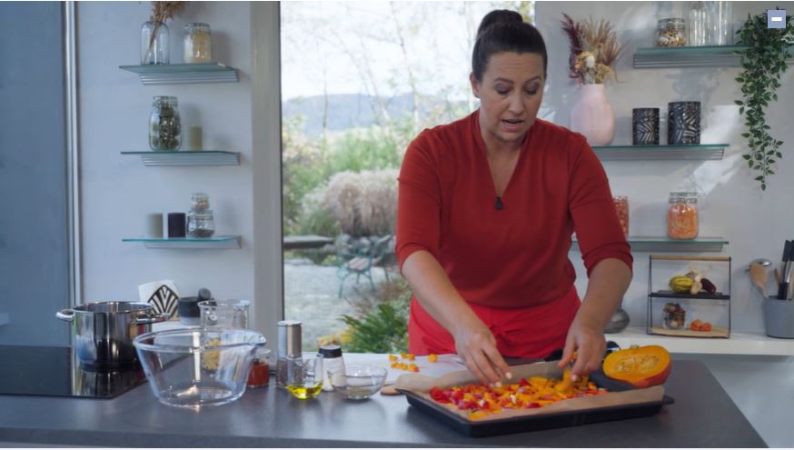 Gemüse putzen und in Würfel schneiden. Auf ein Backblech legen und mit Öl und Gewürzen mischen.