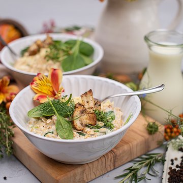 Den Porridge mit den gebratenen Champignons, etwas frischem Spinat, geriebenem Käse und Kresse garniert servieren.