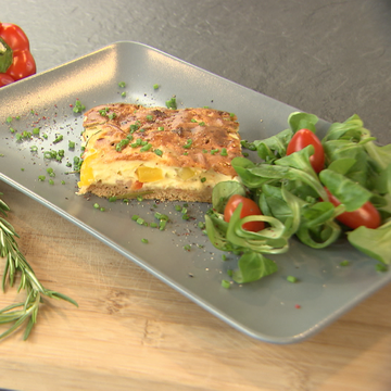 Die Paprika in kleine Stücke schneiden und optional mit Schinken und Speck verrühren.
