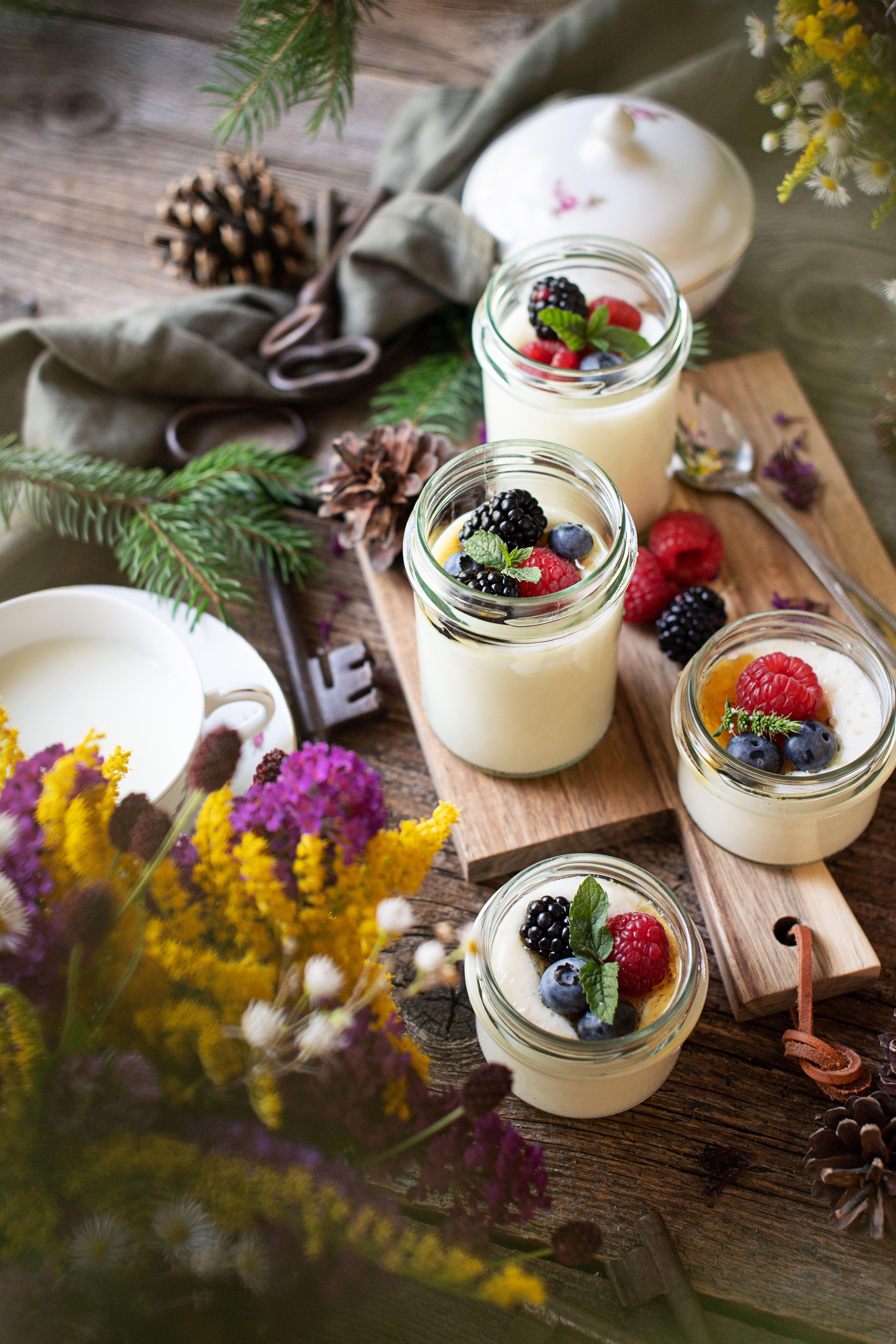 Den Honig mit Wasser erwärmen und sobald das Bachlkoch ein wenig abgekühlt ist, den Honig darüber gießen. Dann mit Minze und frischen Beeren garnieren.