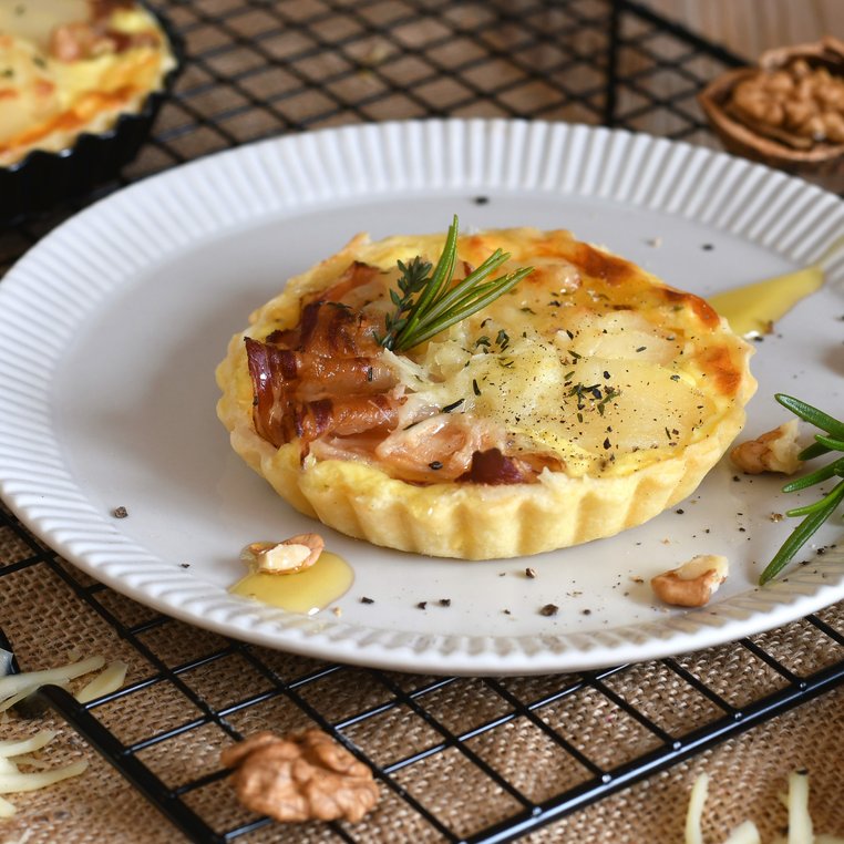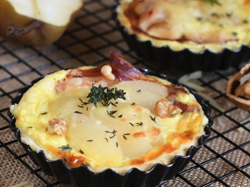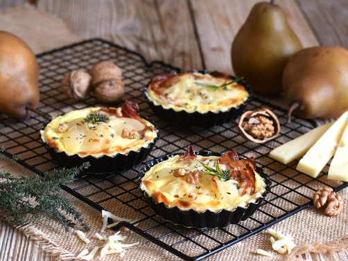 Käse-Eier-Mischung in den Tartelettes verteilen. Speck und Birnenfächer auf die Füllung legen und mit restlichem Käse bestreuen.