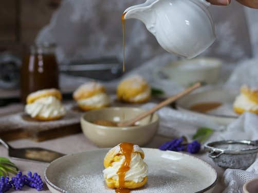 Brandteigkrapferl mit einer Schere auseinanderschneiden und mit dem Schlagobers füllen.