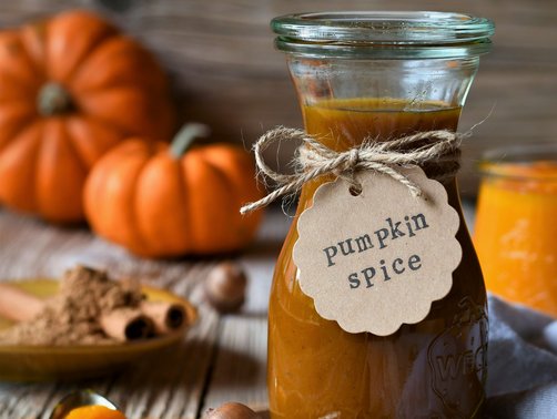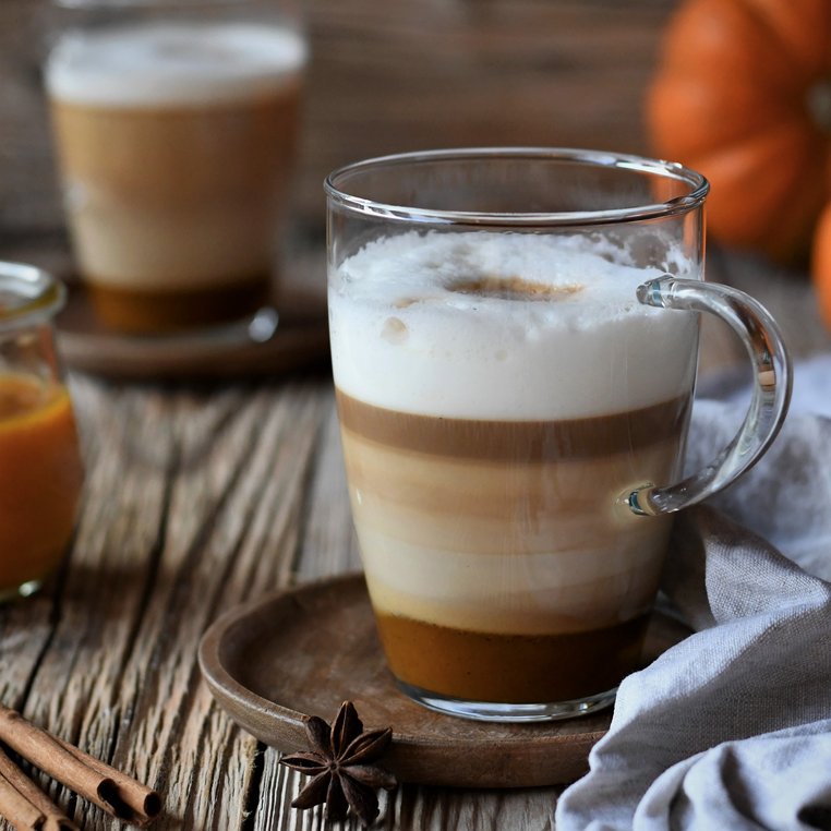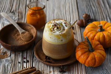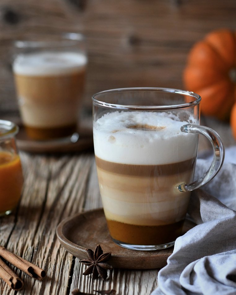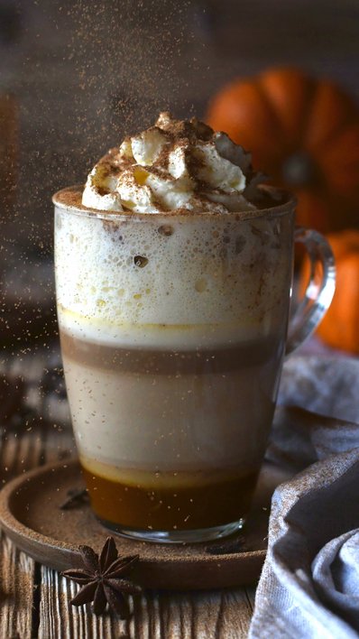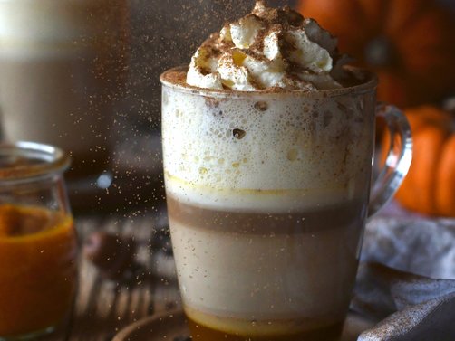Pumpkin Spice Latte mit Schlagobers und Pumpkin Spice garnieren.