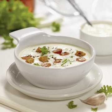Den Gemüsefond mit Kümmel aufkochen, den Rahm mit Mehl gut versprudelt in die kochende Suppe geben, 10 Minuten kochen, mit Essig und Kräutern abschmecken und die Knoblauchzehen feingehackt beimengen.