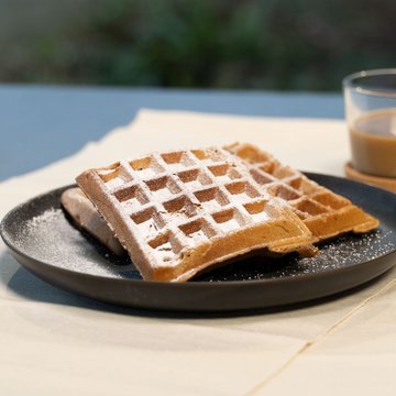 Waffelteig portionsweise im Waffeleisen ausbacken und mit frischen Früchten servieren.