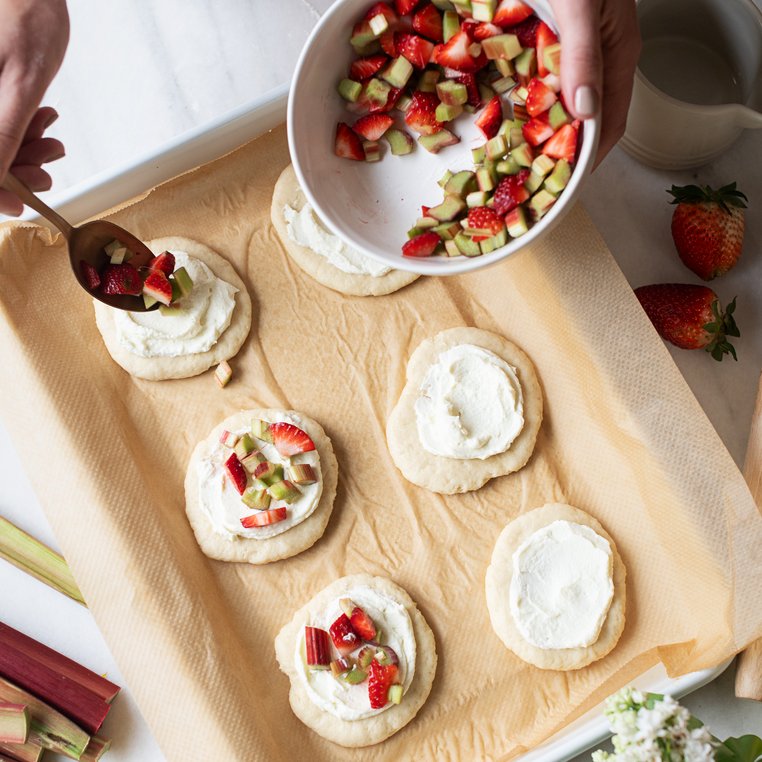 Den Rhabarber schälen und klein schneiden. Die Erdbeeren waschen, von den Stielen befreien und kleinschneiden. Das Obst in einer Schüssel zur Seite stellen.
