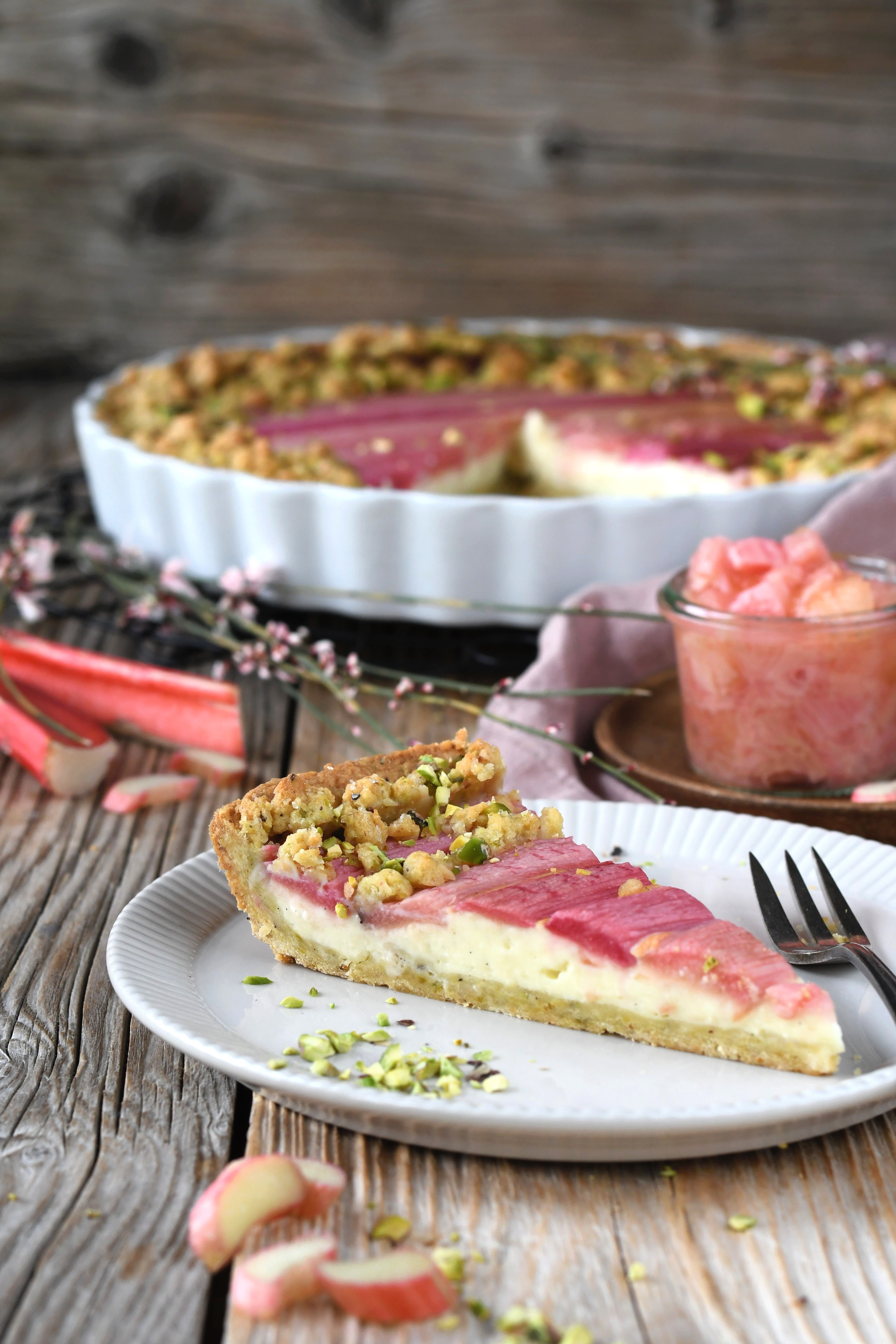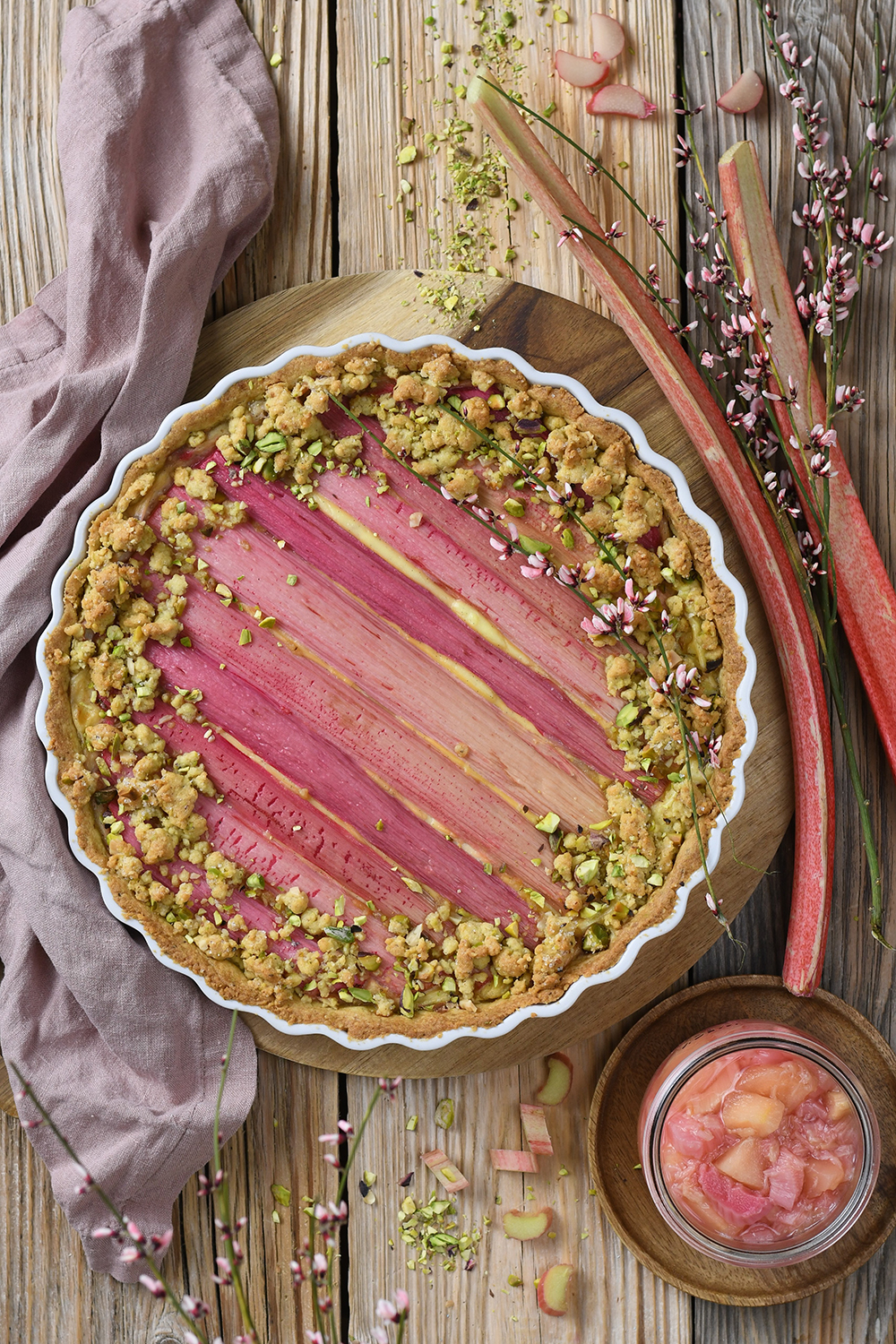 Den Pudding am Mürbteig verteilen und mit Rhabarberstangen belegen.