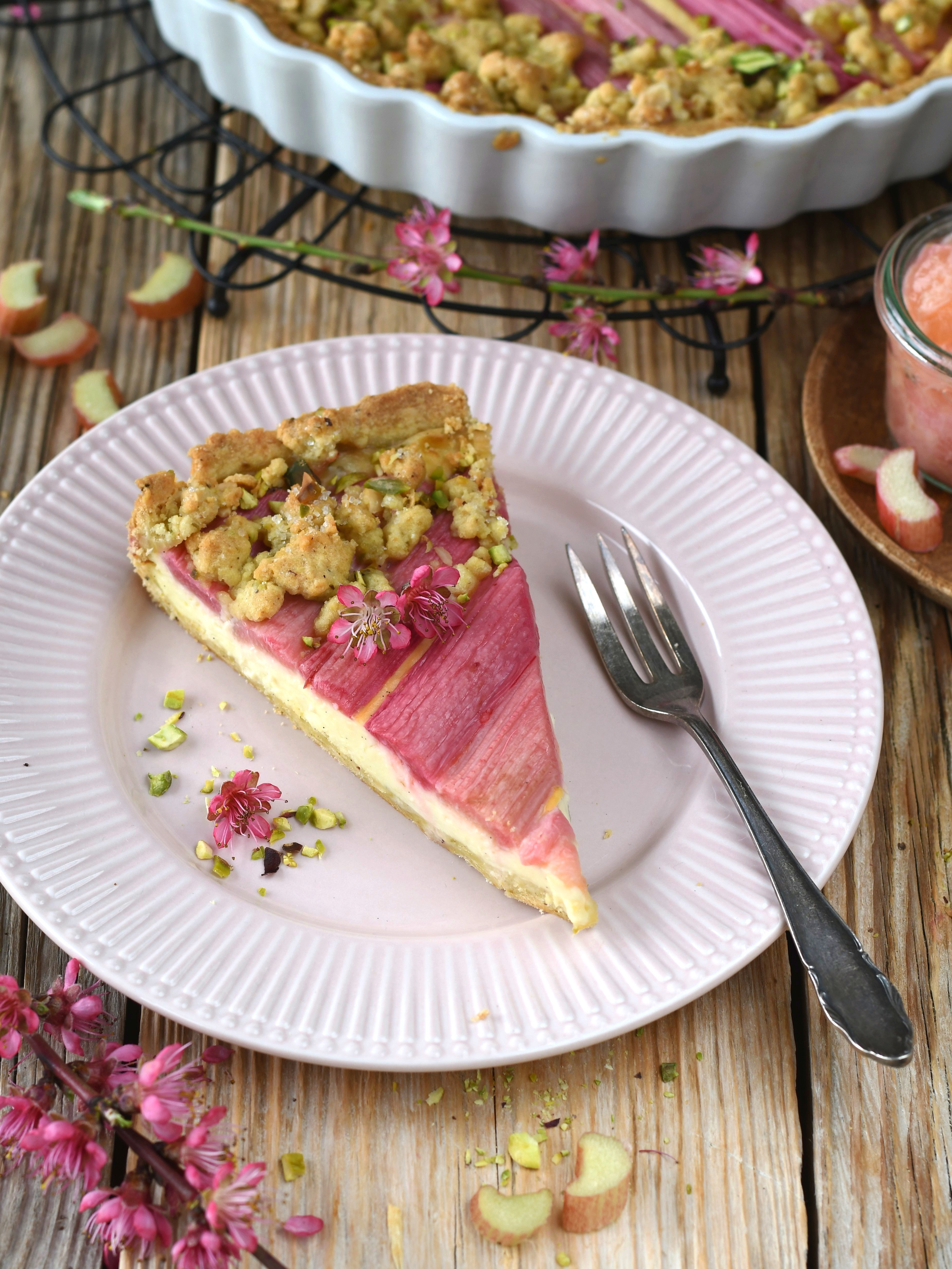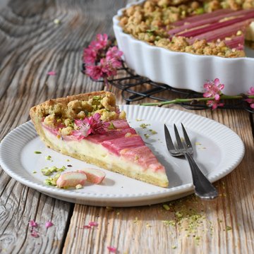 Die Tarte 40 bis 50 Minuten backen, bis der Pudding gestockt ist und die Streusel goldbraun sind.
