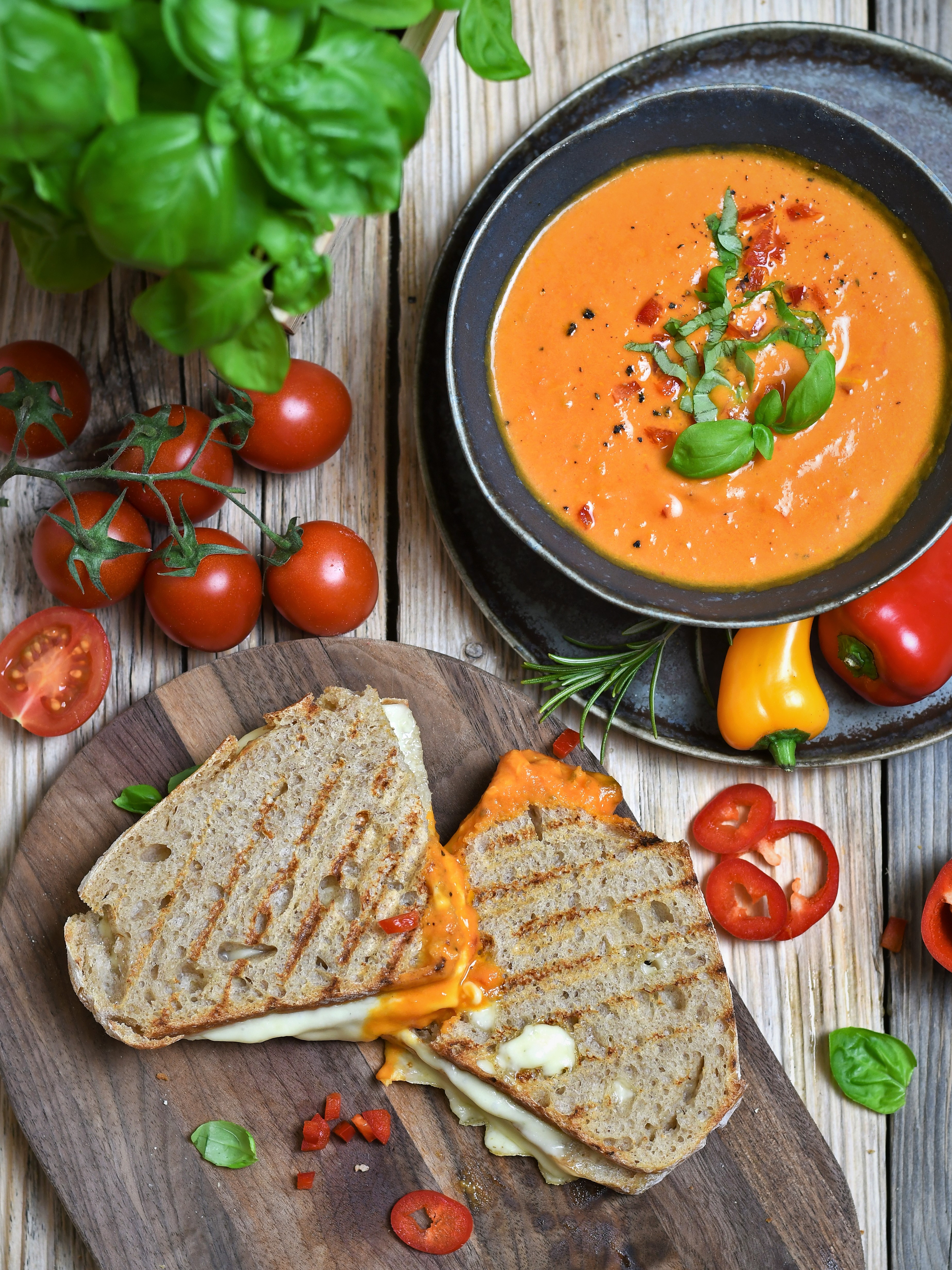 Gemüse, Schlagobers, Gemüsebrühe, Tomatenmark, Tomatenpassata und Basilikum im Standmixer fein pürieren.