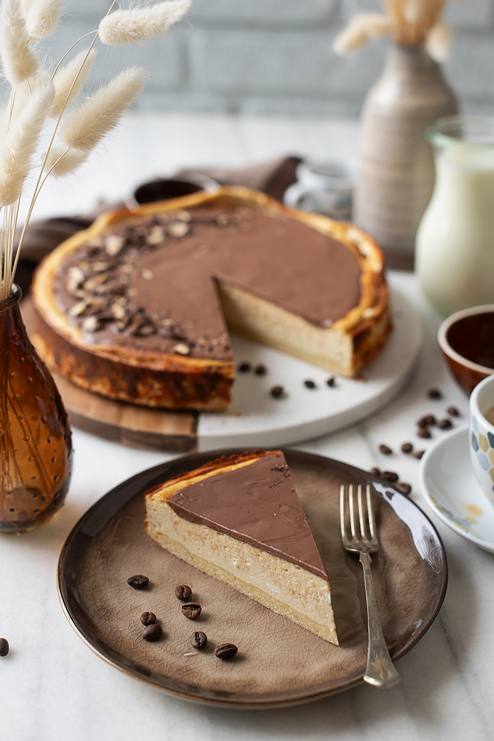 Schokolade und Butter schmelzen und auf dem ausgekühlten Cheesecake verteilen. Mit gehackten Kaffeebohnen garniert servieren.