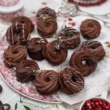 Die Masse in einen Spritzbeutel mit Sterntülle füllen und kleine Kringel auf ein mit Backpapier belegtes Backblech setzen. Die Kringel im vorgeheizten Backrohr bei 190 °C Heißluft für rund 15 Minuten backen. Nach dem Backen vollständig auskühlen lassen.