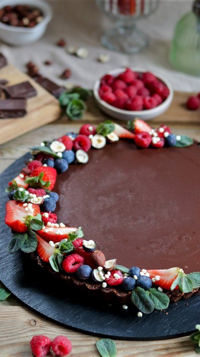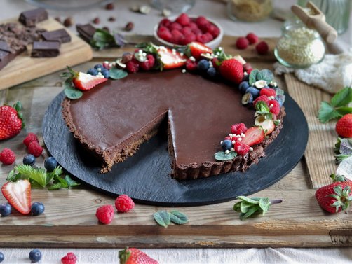 Die fertige Tarte nach Belieben mit frischen saisonalen Beeren, gerösteten Nüssen und Hirse-Pops dekorieren.