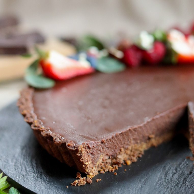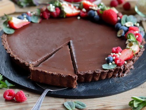 Die Schokoladentarte für einige Stunden im Kühlschrank auskühlen lassen, bis sie fest wird.